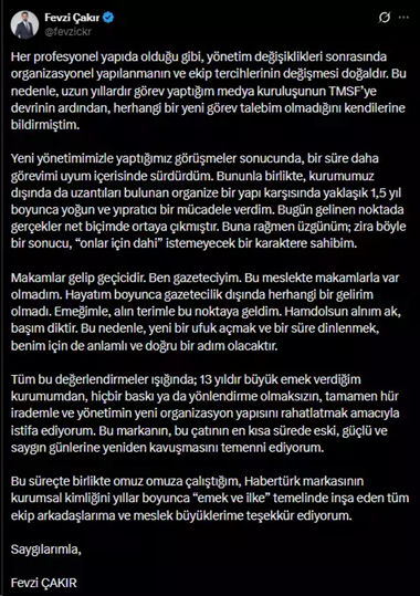 Fevzi Çakır, 13 yıldır görev yaptığı kurumdan tamamen kendi özgür iradesiyle ayrıldığını vurgulayarak, istifa kararının yeni yönetimin organizasyon yapısını rahatlatmak amacı taşıdığını belirtti. Açıklamasının sonunda ise Habertürk’ün en kısa sürede eski, güçlü ve saygın günlerine kavuşması temennisinde bulunarak, birlikte çalıştığı tüm ekip arkadaşlarına ve meslek büyüklerine teşekkür etti.