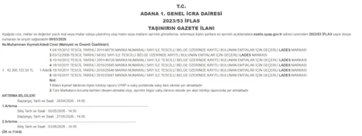 Adana 1. Genel İcra Dairesi tarafından yayımlanan ilana göre, “Lades” markasına ait tüm haklar açık artırma yöntemiyle yeni sahibini bulacak. Farklı tarihlerde tescil edilmiş ve çeşitli ürün gruplarını kapsayan marka için belirlenen toplam muhammen bedel ise 42 milyon 395 bin TL oldu.